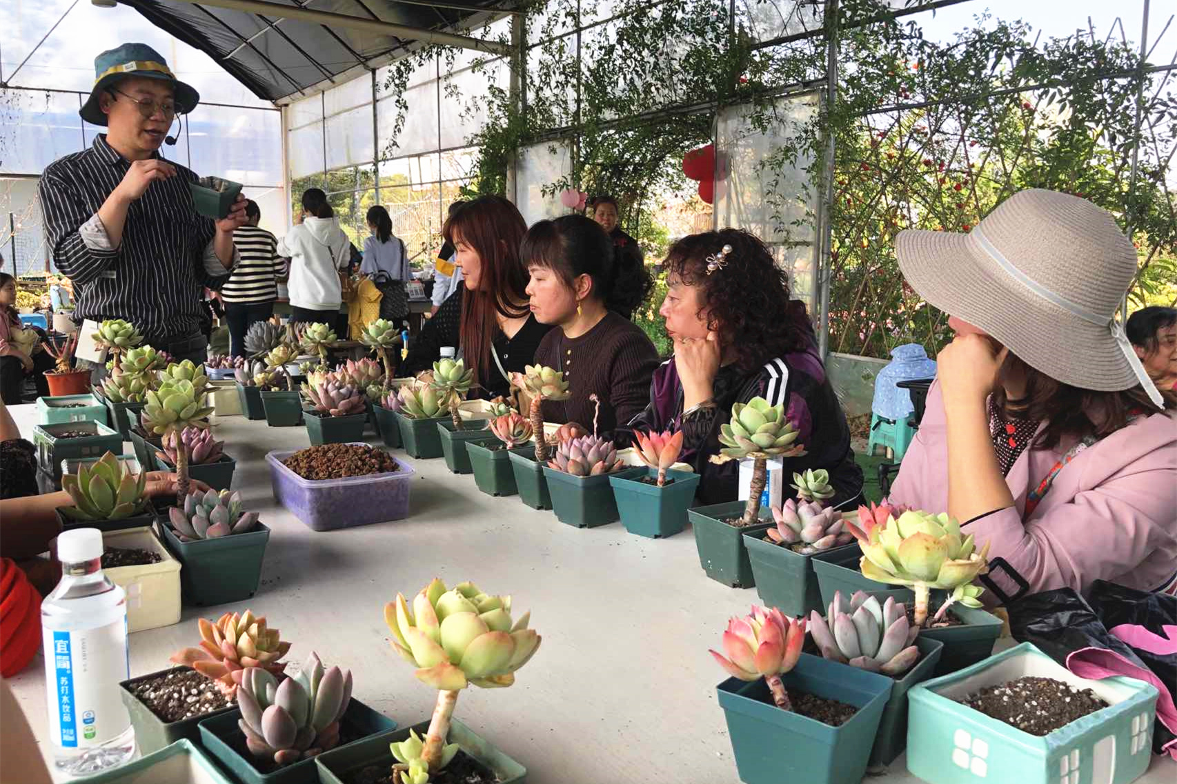 活動伊始,段昌敏代表工會女工委員會向在場女性同胞們送上了節日祝福,并組織大家參觀了多肉植物園。隨后,多肉植物園園主為女職工們科普多肉植物,并講授如何培養多肉,期間的有獎競答將活動引入了高潮。在進行別具一格的多肉植物DIY時,大家圍坐在一起,在園主的講解和指導下,饒有興趣的開始栽種。剖土、栽種、鋪面、美化……一盆盆“小巧呆萌”的組合多肉呈現在眼前。大家都樂在其中,一會兒談笑風生,一會兒相互協助、拍照留念,讓活動在愉快的氛圍中有序開展。