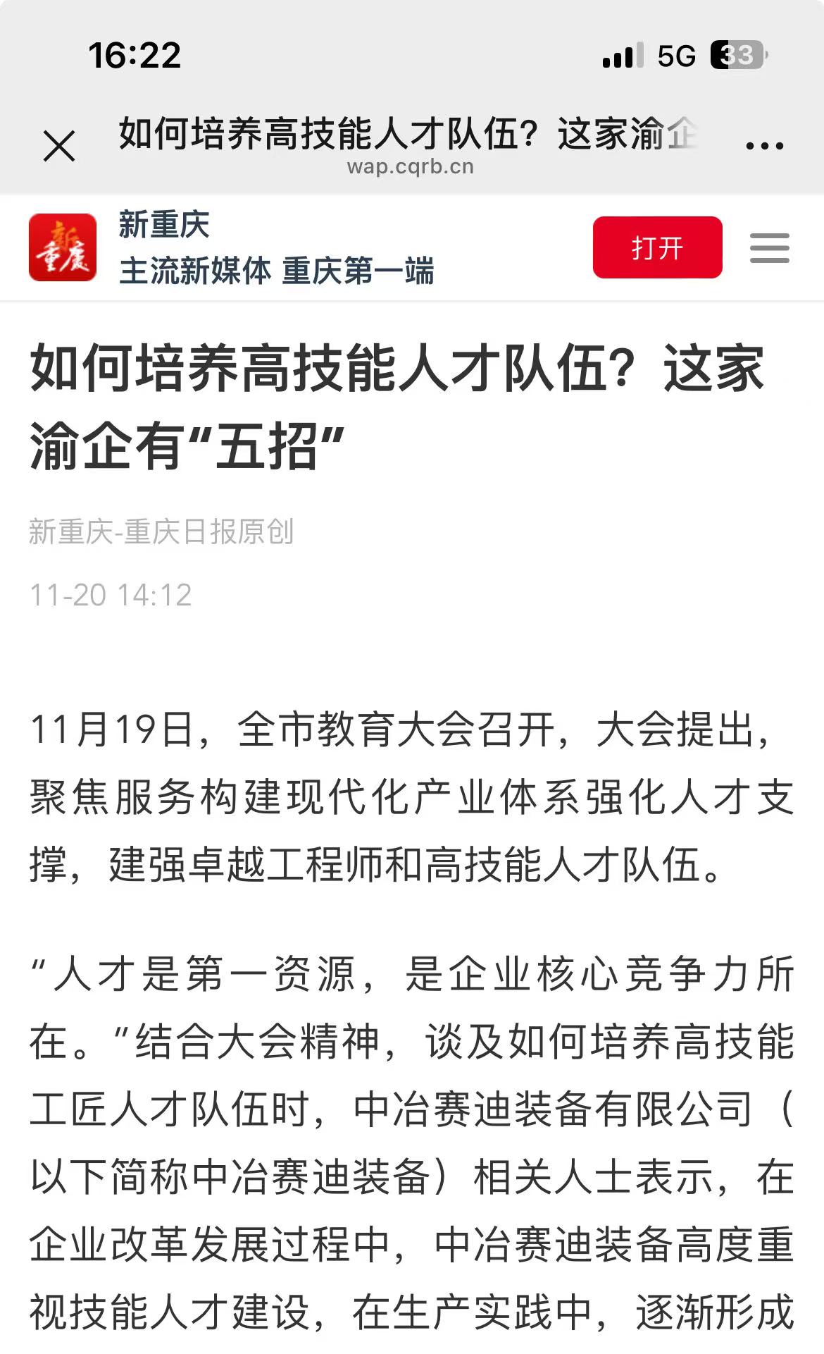 11月19日,全市教育大會召開,大會提出,聚焦服務構建現代化產業(yè)體系強化人才支撐,建強卓越工程師和高技能人才隊伍。 11月20日,新重慶-重慶日報以“如何培養(yǎng)高技能人才隊伍?這家渝企有‘五招’”為題,報道中冶賽迪裝備在技能人才建設中的經驗做法。
