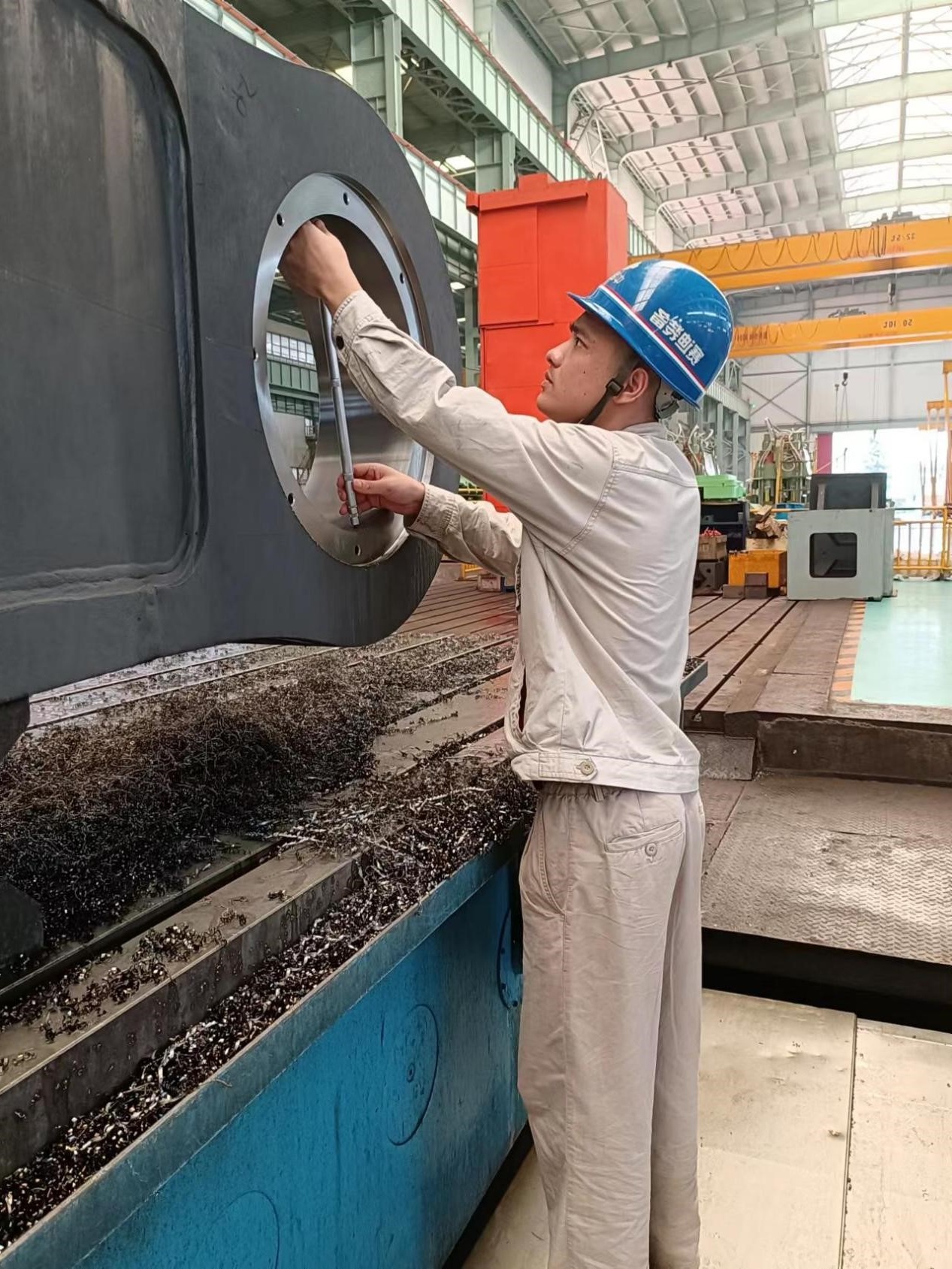 在公司首次承制的“傾動減速機”項目中,其箱體中心孔為直徑φ1750毫米,業內還從未在鏜床上加工過如此大規格的孔。我們憑借多年經驗,并多方考慮公司設備的特性,提出了“平旋盤+卡座+標準鏜盤”的加工方法,自主設計制作工裝,終于趕跑了這個“攔路虎”,完成了公司首次φ1500mm以上鏜孔的加工。這些核心裝備在客戶那里實現了穩定運行,幫助客戶生產出優質產品。這讓我感到由衷的自豪。