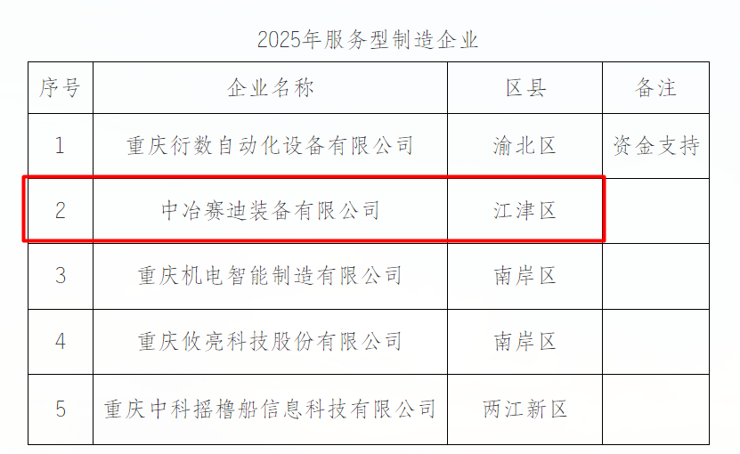 8月11日,中冶賽迪裝備申報(bào)的"綠色冶金與高端裝備服務(wù)型制造企業(yè)"通過(guò)重慶市經(jīng)濟(jì)和信息化委員會(huì)審批,成功入選重慶市2025年服務(wù)型制造企業(yè),這標(biāo)志著中冶賽迪裝備在科技創(chuàng)新、研發(fā)中試、制造型服務(wù)業(yè)建設(shè)以及引領(lǐng)行業(yè)產(chǎn)業(yè)轉(zhuǎn)型升級(jí)方面,取得階段性成果。
