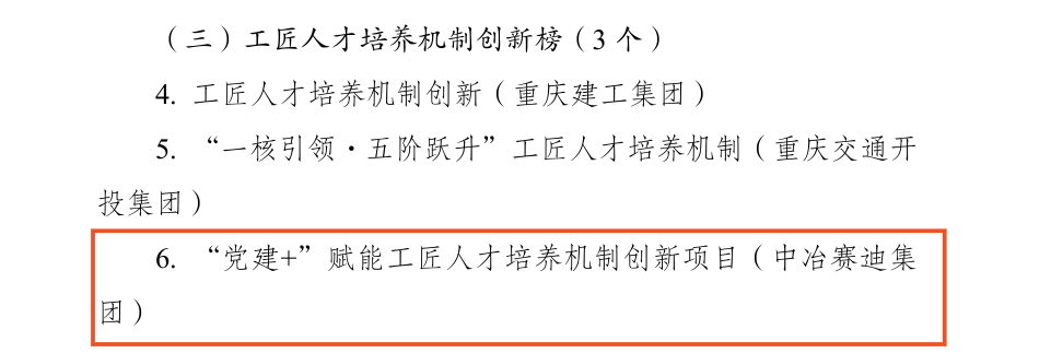 近日,重慶市國資委黨委發布首次市國資系統黨建工作改革創新“揭榜掛帥”行動驗收結果。中冶賽迪裝備“‘黨建+’賦能工匠人才培養機制創新”獲評“工匠人才培養機制創新榜”優秀項目。